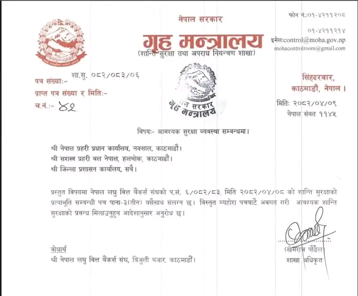 लघुवित्त बैंकर्स संघको पत्र संख्या ६।०८२।८३, मिति २०८२ श्रावण ८ सुरक्षाको प्रत्याभूपत सम्बन्धी पत्र अनुसार, गृहमन्त्रालयको मिति २०८२ श्रावण ९ गतेको च.न. ४२ को पत्रअनुसार नेपाल प्रहरी, सशस्त्र प्रहरी र सबै जिल्ला प्रशासन कार्यालयलाई सुरक्षा व्यवस्था कडा पार्न आदेश दिएको हो। यस निर्देशनअनुसार, देशभरका लघुवित्त शाखा र कर्मचारीको सुरक्षा सुनिश्चित गर्न विशेष सतर्कता अपनाइनेछ।